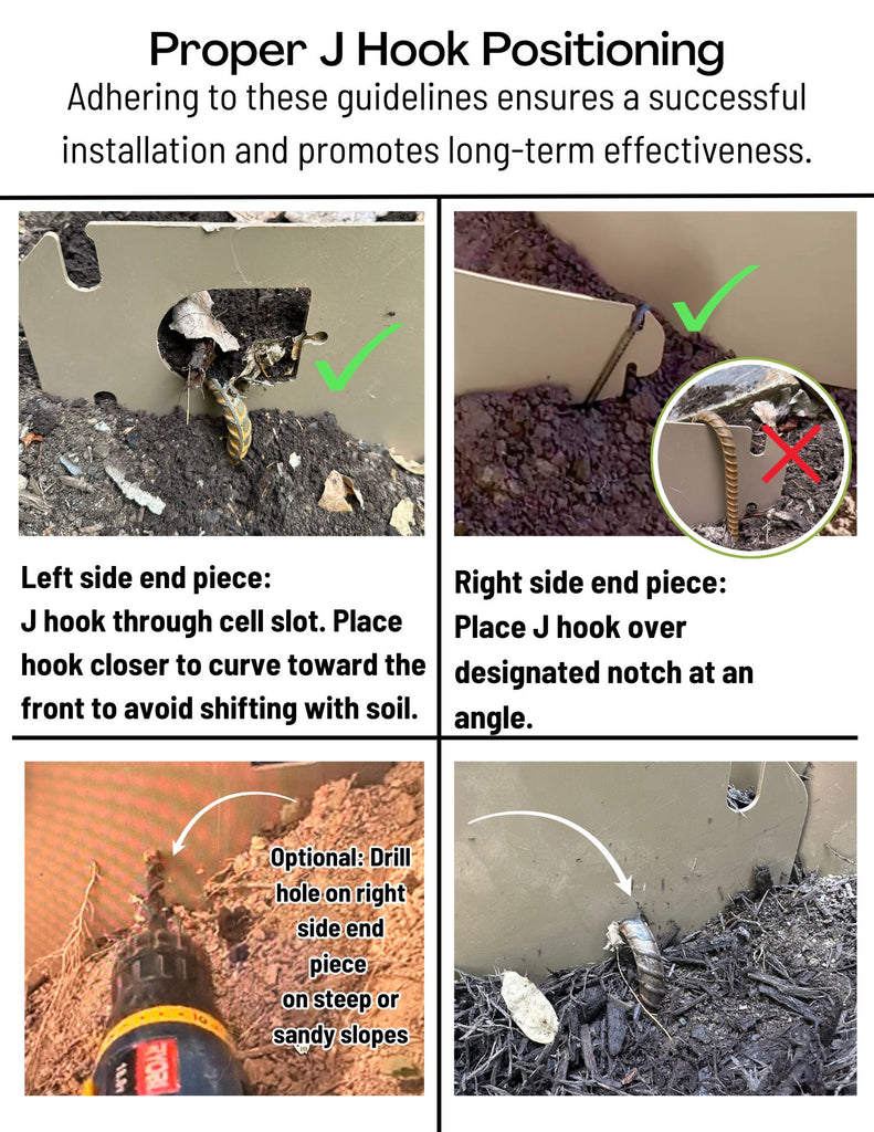 The same application applies to slopes over 36° as to eliminate the added force from the row above and secure the row with additional j hooks. That said, you might want to have a few extra j hooks on hand, and depending on the scale of your project, potentially 30-50% more.