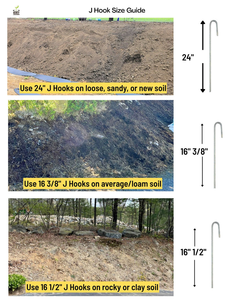 The Dirt Locker® works in conjunction with any type of soil across the globe from condensed clay, to rocky, sandy, or silt, you name it! Therefore, the best soil for backfilling your Dirt Locker® system is going to be closest to the native soil that exists on the slope, and if possible, to mix in some compost matter at 25% compost 75% native soil. If that is not possible, we recommend 75% topsoil, and 25% compost or similar mixture. A nursery could give guidance if you are still unsure on what is best to use in your specific region. As your plants grow within the nurturing aid of the Dirt Locker®, it will start to change the composition of the soil underneath the system to much richer, nutrient dense soil. For rocky soil that may be difficult to install the J hooks, we recommend drilling into your soil using a 1/2” drill bit 16-24”L to get the depth you need to secure the system in place. Calculate fill in cubic feet by multiplying .375 by Small quantity, 1 by Medium quantity, and 1.5 by Large quantity. Divide total cubic feet by 27 to get total cubic yards.